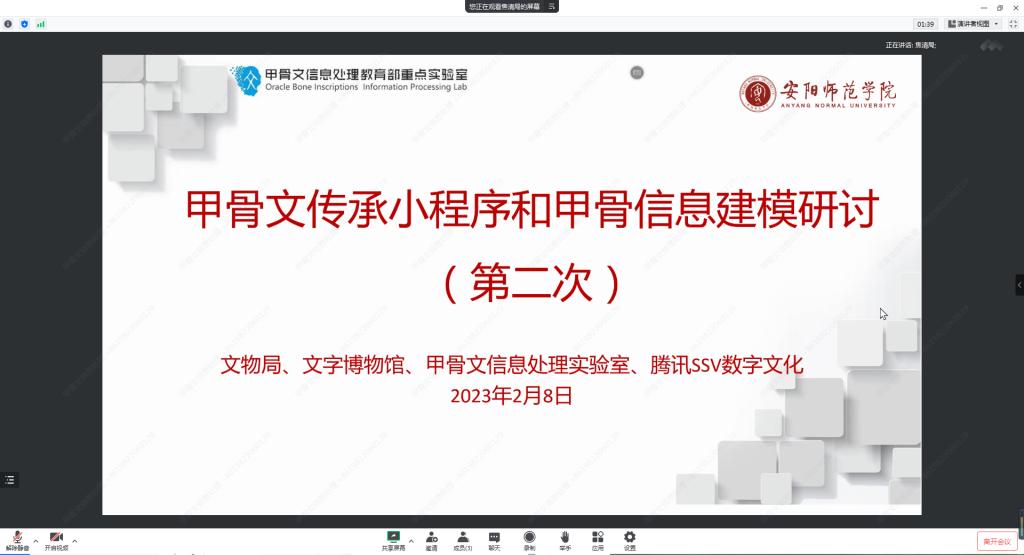 2023年2月8日,甲骨文研究工具箱和传承小程序研讨会第二次会议在实验室召开。参加此次会议的单位有腾讯SSV数字文化实验室,腾讯优图实验室,安阳市文物局等。实验室主要成员参加了此次会议,会议由实验室主任刘永革主持。