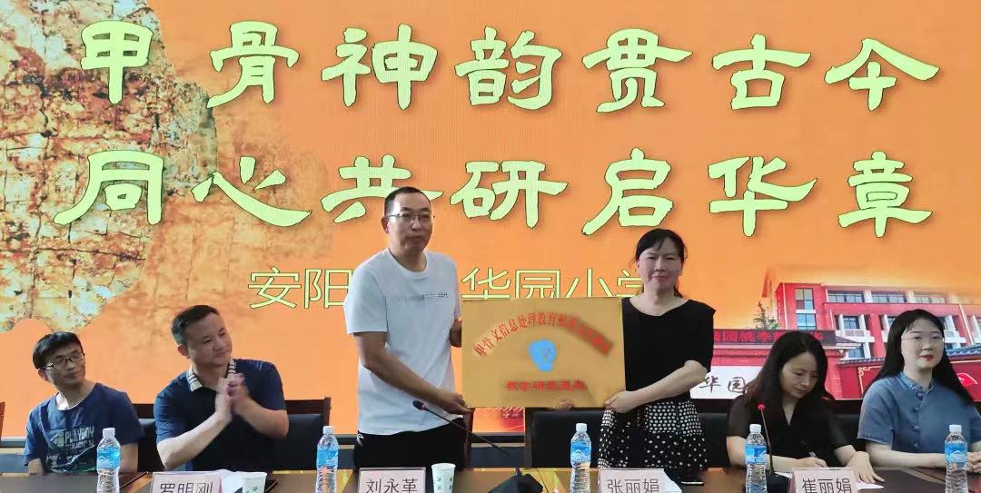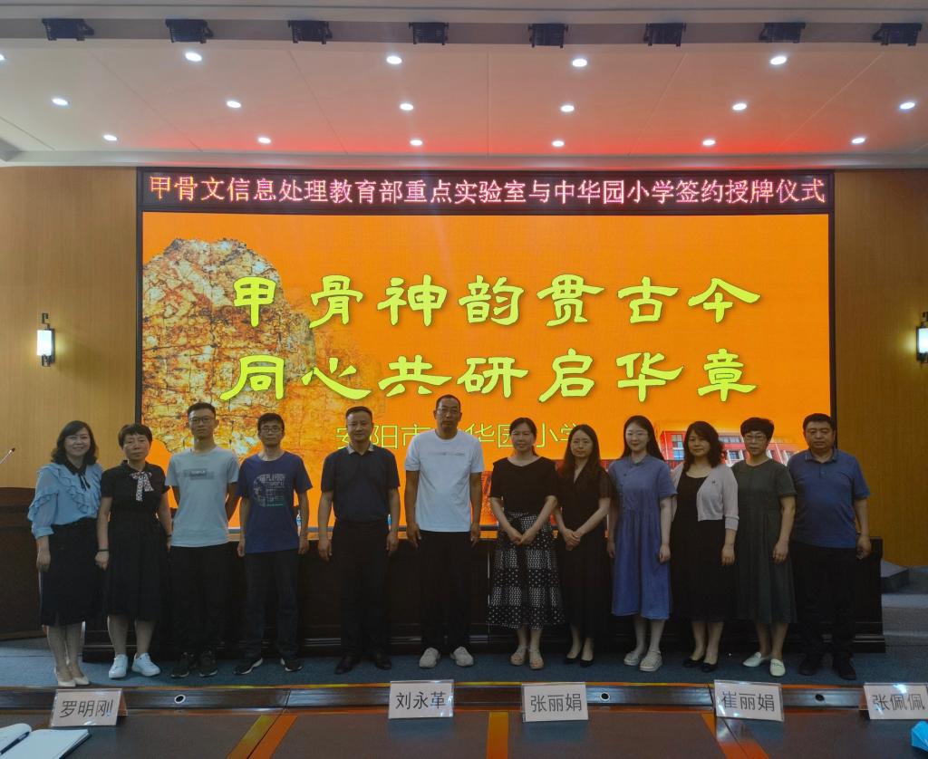 2022年6月9日下午,实验室与中华园小学签约授牌仪式在中华园小学举行。安阳市教育局语委办主任罗明刚,北关区教育局党组成员、青少年活动中心主任崔丽娟,督导室主任高东瑞,河南法制报驻豫北地区安全新闻部主任郭伟,实验室主任刘永革,副主任高峰,实验室甲骨文与殷墟科技考古研究室主任韩胜伟,办公室副主任张珮珮出席仪式。