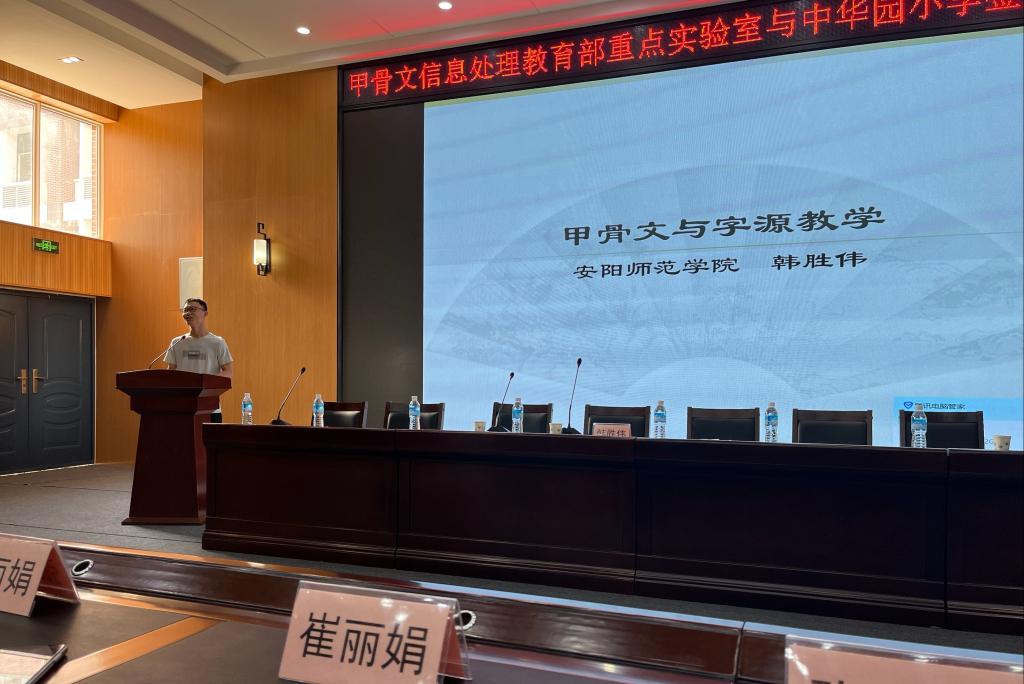 仪式后,实验室甲骨文与殷墟科技考古研究室主任韩胜伟博士作了题为《甲骨文与字源教学》的学术报告。会后,与会人员参观了中华园小学,感受到了这里浓厚的甲骨文特色校园文化,并观摩了学生篮球操表演。
