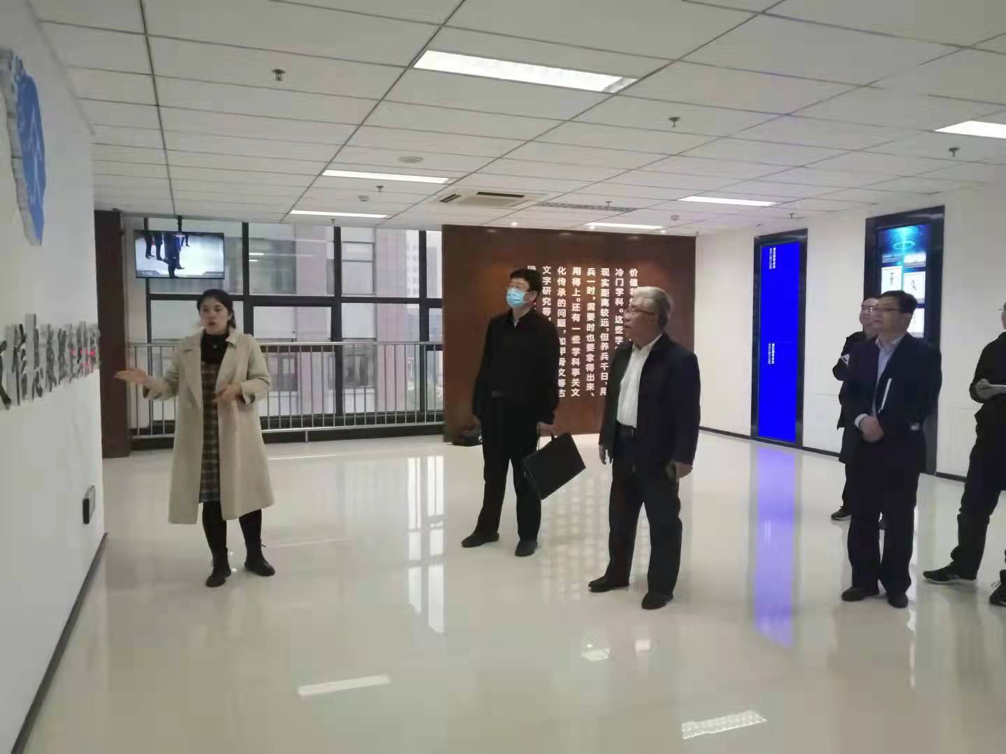 杨宏一行先后对实验室的展示长廊、图书资料室等进行了参观。邱晨老师对实验室的建设历程、研究方向以及实验室的代表性成果“殷契文渊”大数据平台等向杨宏一行做出了详细地介绍。