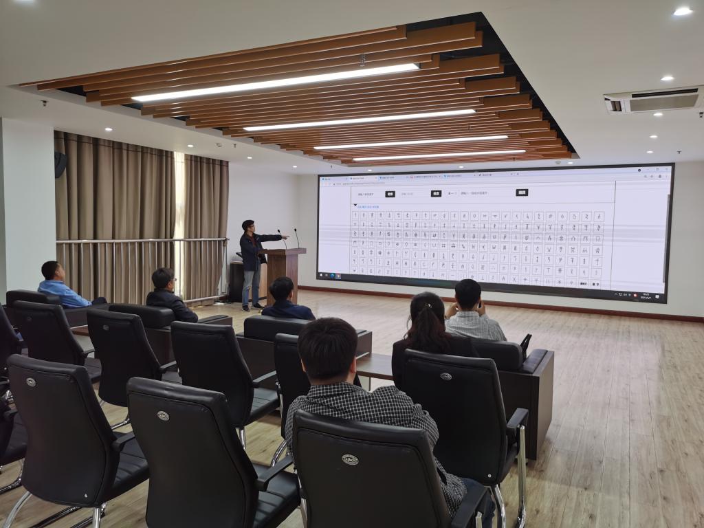 在成果展示厅,高峰副主任向万鹏杰副校长一行展示了“殷契文渊”中文献库、著录库、字形库的功能及建设情况,并就“殷契文渊”的含义、缀合库建设等问题进行了深入地讲解。