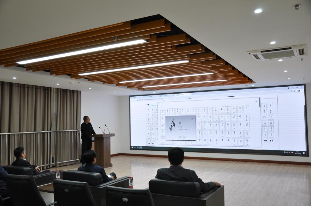 在实验室展示长廊,刘永革主任向考察组领导介绍了实验室的概况及发展历程。之后,在成果展示厅刘永革主任为考察组成员展示了实验室代表性成果“殷契文渊”大数据平台,并具体介绍了文献库、著录库、字形库的功能及建设情况。