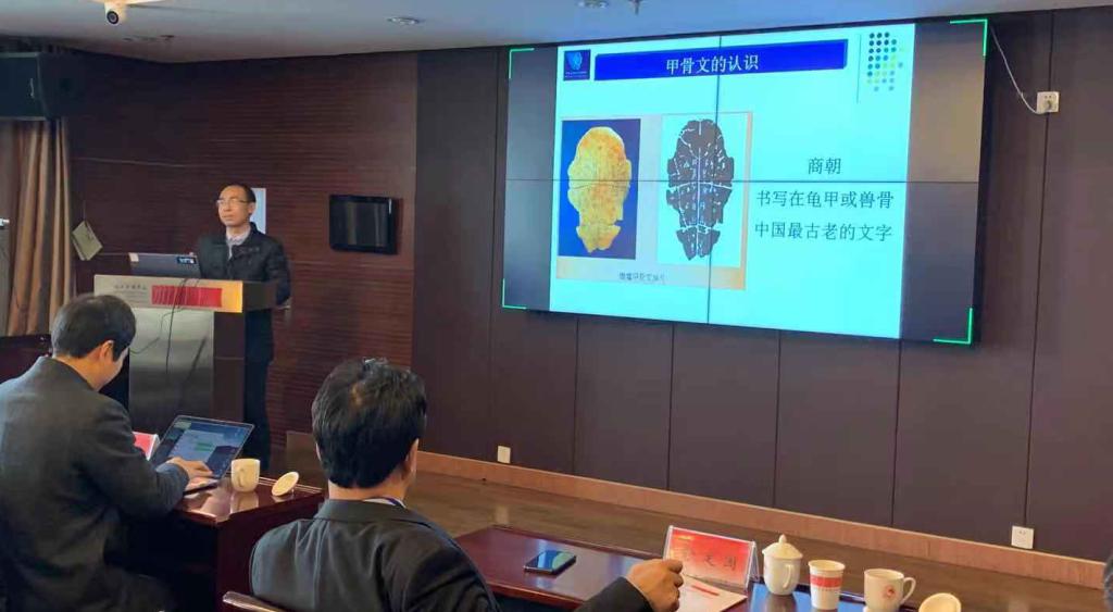 会上,实验室副主任焦清局作了关于《甲骨文研究现状与殷契文渊建设情况》的报告。报告就甲骨字语义预测、甲骨缀合等方面与参会嘉宾做了深入地探讨。焦清局从甲骨文文献的整理工作,甲骨文特性推理以及甲骨碎片边缘拼接等方面介绍了实验室在甲骨文信息处理方面的研究现状与展望。