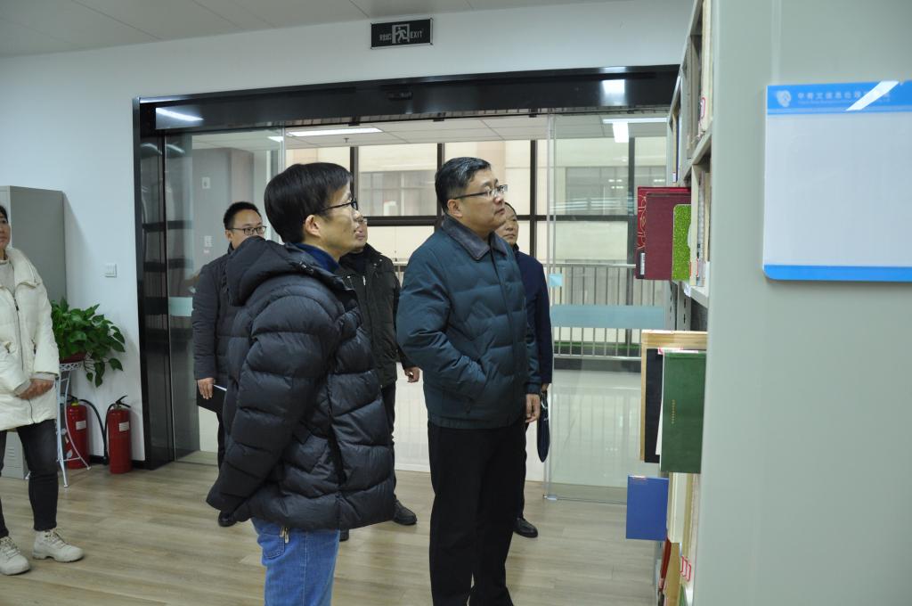 李洪副局长一行先后参观了实验室图书资料室、展示长廊。在成果展示厅,高峰副主任向李洪一行介绍了实验室代表性成果“殷契文渊”大数据平台,并介绍相关功能。