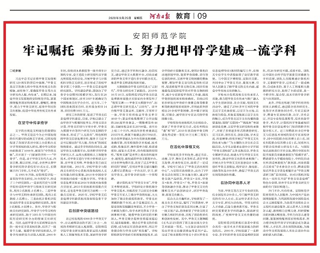 《河南日报》2020年9月25日教育专版刊登了我校党委书记纪多辙的署名文章《牢记嘱托 乘势而上 努力把甲骨学建成一流学科》。