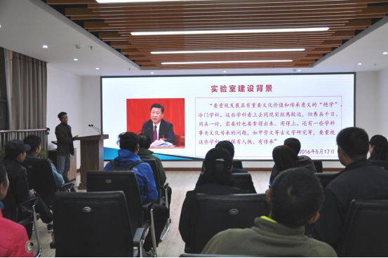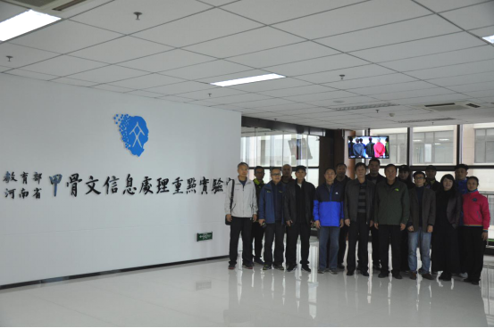 老师们先来到实验室东厅参观,了解了实验室工作人员的日常工作环境,老师们感叹实验室良好的工作氛围。参观完东厅他们一行来到实验室西厅参观了图书资料室、数据加工室和学生工作室,最后,到成果展示厅听取高峰老师的介绍和汇报。高老师介绍了实验室的发展研究过程、实验室的研究方向、实验室学术委员会成员以及“殷契文渊”大数据平台的建设过程和使用方法。高老师提到实验室目前的工作是紧紧围绕习近平总书记贺信中提到的“多学科协同开展甲骨文研究和应用”指示精神,今后实验室会继续推动甲骨文研究和应用向实处做、向深处走、向高处攀。报告结束时,高老师希望有兴趣的师生能加入实验室,与实验室成员交流学习、共同发展,真正实现跨学科的融合。