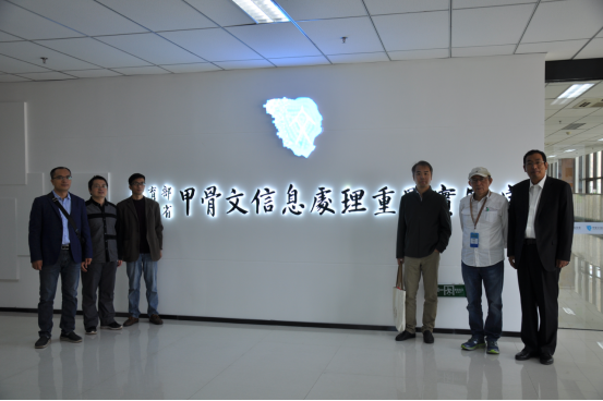 刘永革首先带领两位教授参观了实验室展板,了解了实验室的发展状况;随后刘永革陪同陈光宇和莫伯峰先后参观了实验室东厅、实验室数据加工室、图书资料室、学生工作室和成果展示厅,并在成果展示厅展开微型学术讨论会。随行的实验室成员及其他学校教师虚心向两位教授请教有关交叉学科研究的方法,就他们在研究过程中遇到的问题向两位教授提问。陈光宇教授和莫伯峰副教授亲切并耐心地为老师们解答,他们鼓励老师们抓住机遇、迎接挑战、不惧困难,努力将自己的学科与甲骨学研究联系在一起,找寻突破口,开拓创新。实验室成员和参与教师深受鼓舞。